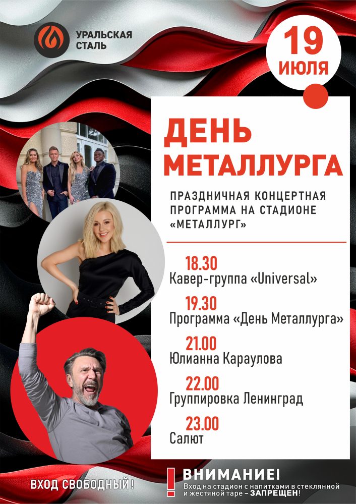 Уральская Сталь традиционно готовит яркие события для жителей и гостей Новотроицка. Этот год не станет исключением — кульминационным событием дня станет поздравление металлургов руководителями региона, города и компании на главном стадионе города. Для новотройчан и гостей здесь выступят: кавер-группа «Universal», Юлианна Караулова и Группировка Ленинград. 18+