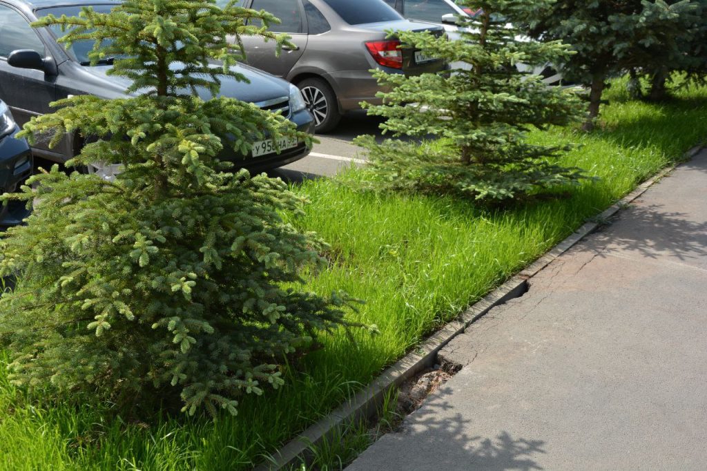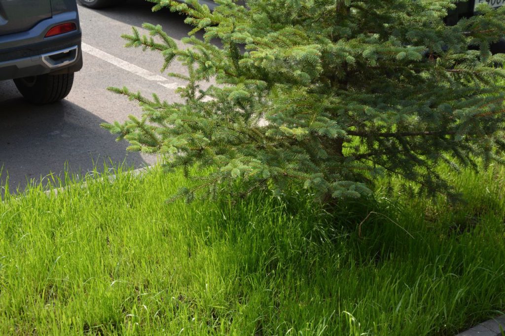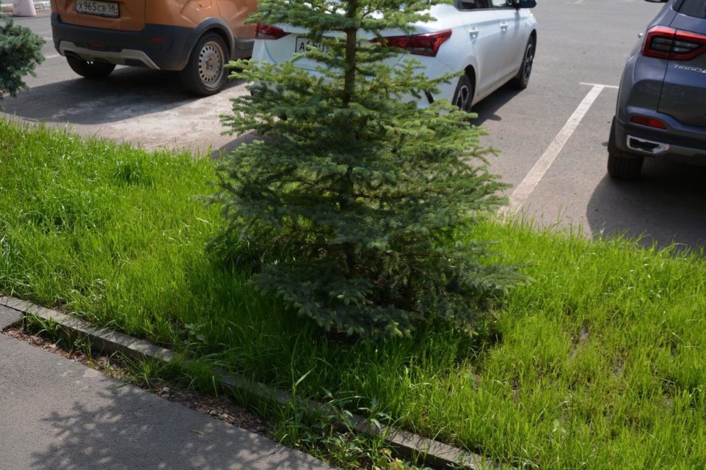 Стройный ряд вечнозеленых елочек появился на участке сквера вдоль улицы Маршала Жукова несколько лет назад. Несмотря на то, что эксплуатирующей организации заранее предоставили план пролегания коммуникаций на территории, в границах охранной зоны трубопровода разбили газон и посадили ёлки.