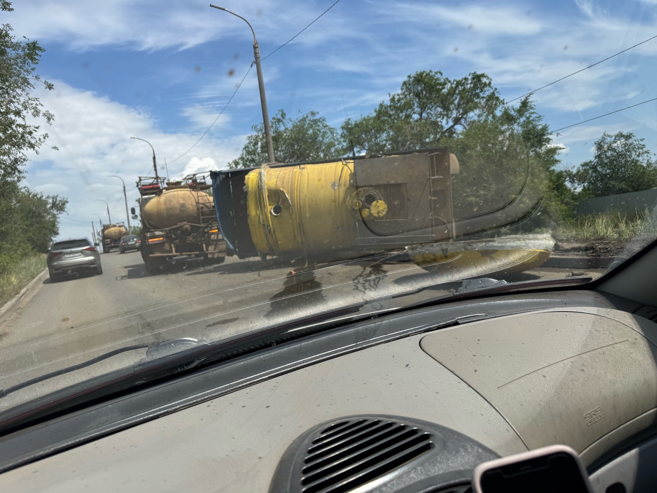 ДТП произошло днем 24 июня на участке виадука по улице Донгузской Оренбурга. Во время подъема прицеп-цистерна сорвался со сцепки и опрокинулся на бок.