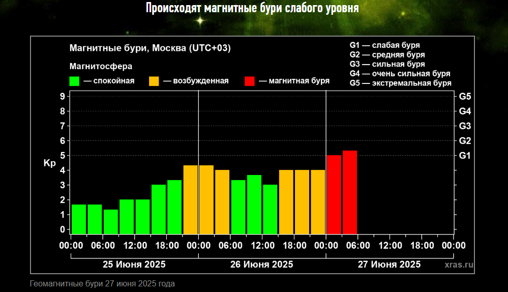 — Значительного роста интенсивности магнитных колебаний не ожидается. Несмотря на исключительно высокую скорость солнечного ветра (до 800 км/с), общее воздействие на планету является умеренным и к бурям уровня выше G2 привести не должно, — сообщили в лаборатории солнечной астрономии РАН.