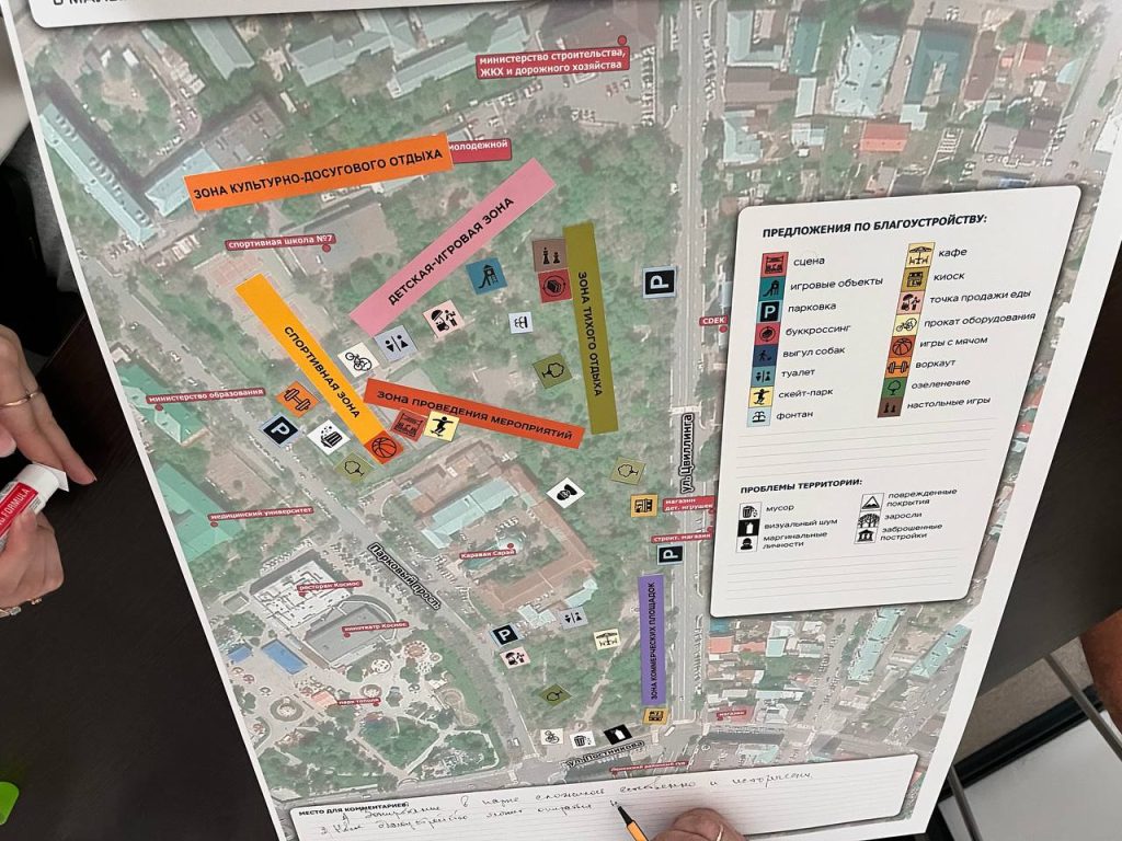 Во время обсуждения жители делились не только общими идеями по благоустройству, но и конкретными наблюдениями, связанными с безопасностью и функциональностью территории. Участники обратили внимание на проблемные участки: отсутствие рабочих туалетов, кучи мусора, разрушенные тротуары и наличие слепых зон в парке: