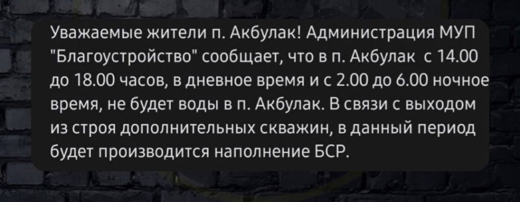 Ранее часть города пользовалась водой низкого качества из скважины, принадлежащей железной дороге, но она не может покрыть потребность Акбулака в водоснабжении. При этом денег в поселковом бюджете на решение проблемы не хватает. Будут ли приняты меры для решения проблемы жителей приграничного населенного пункта, пока не сообщается.