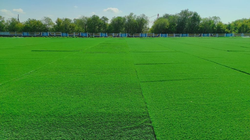 В настоящее время специалисты завершают раскатку газона и приступили к обрезке искусственной травы под размеры футбольного поля. Для обеспечения упругости поверхности и амортизации покрытие засыплют кварцевым песком с добавлением резиновой крошки, что в итоге гарантирует безопасность и сохранение качества в различных погодных условиях.