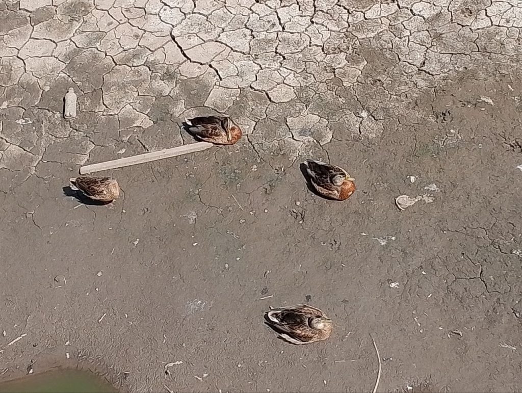 Жаркие июль и август, а также отсутствие источника пополнения воды привели к тому, что от пруда под тропой здоровья осталось несколько луж. Туда по-прежнему прилетают утки, но плавать под тропой уже нельзя.