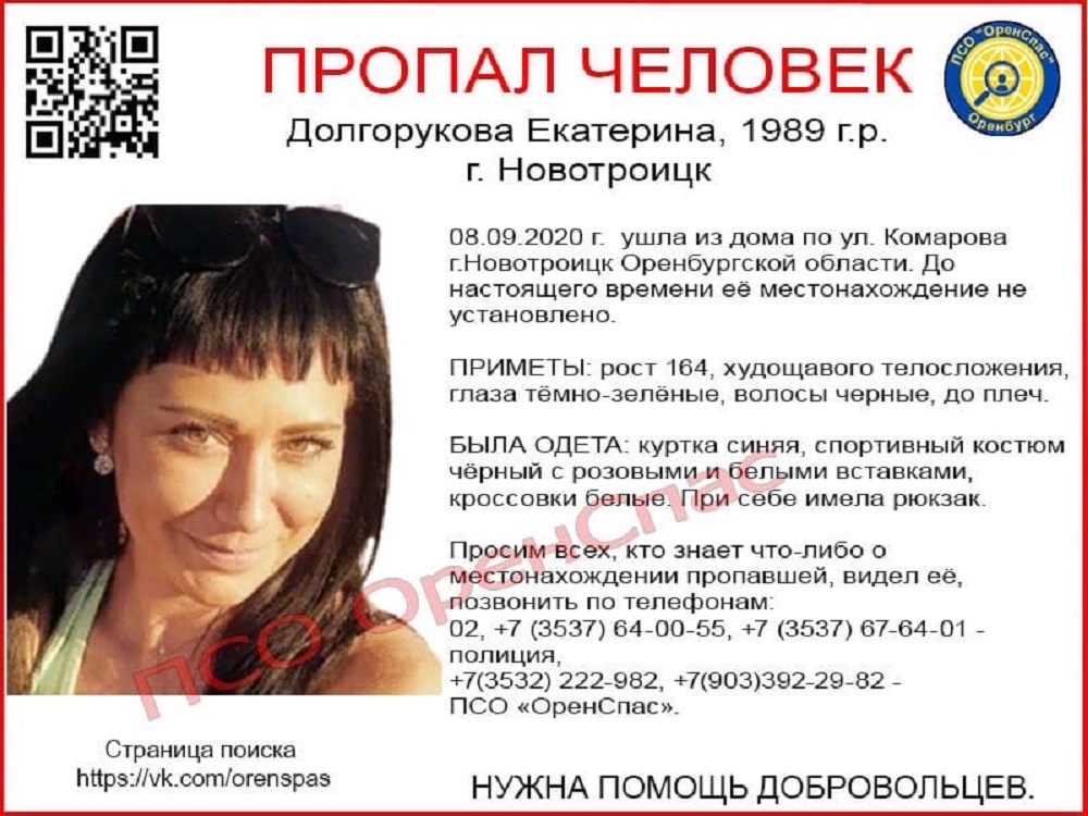 Екатерина Долгорукова 1989 года рождения пропала 8 сентября 2020 года. Девушку ушла из дома по улице Комарова в Новотроицке и пропала. На связь с родственниками не выходит. до настоящего времени её местонахождение не установлено.