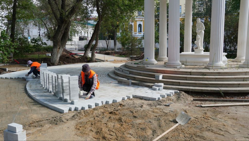 Бригада уже разработала грунт, демонтировала старое покрытие из бетонной плитки, уложила слои геотекстиля, щебня и песка и обустроила бетонное основание с армированием. Сейчас рабочие монтируют тротуарную плитку из гранита.