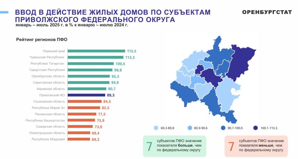 Оренбургстат опубликовал итоговые данные исследования строительного рынка Оренбургской области. По темпам ввода жилья за полугодие регион сохраняет позиции в Приволжском федеральном округе и замыкает ТОП-5 территорий с высокими показателями. С начала года в области сдали 722,3 тысячи квадратных метров жилья.
