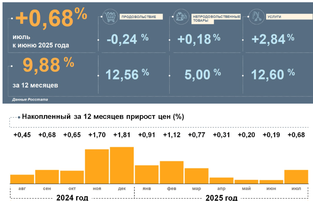 В июле 2025 года цены выросли на 0,68% по сравнению с предыдущим месяцем. Продукты питания подешевели на 0,24%, непродовольственные товары подорожали на 0,18%, а услуги прибавили 2,84%. Такие данные публикует Оренбургское отделение ЦБ РФ.