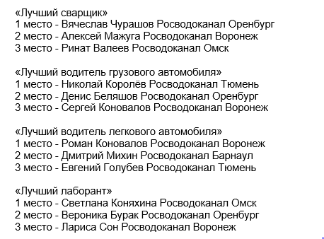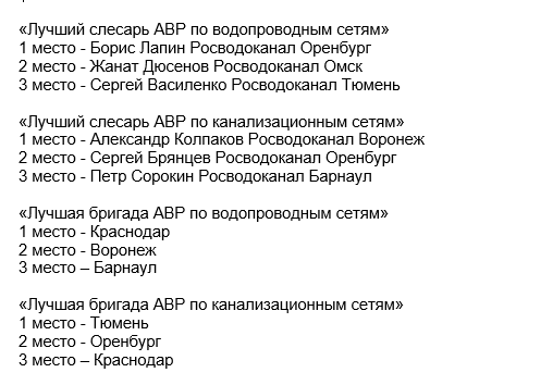 В общекомандном зачете по итогам конкурса лучшим предприятием стал Росводоканал Оренбург. На втором месте оказался Росводоканал Воронеж и замкнул тройку лидеров Росводоканал Тюмень.