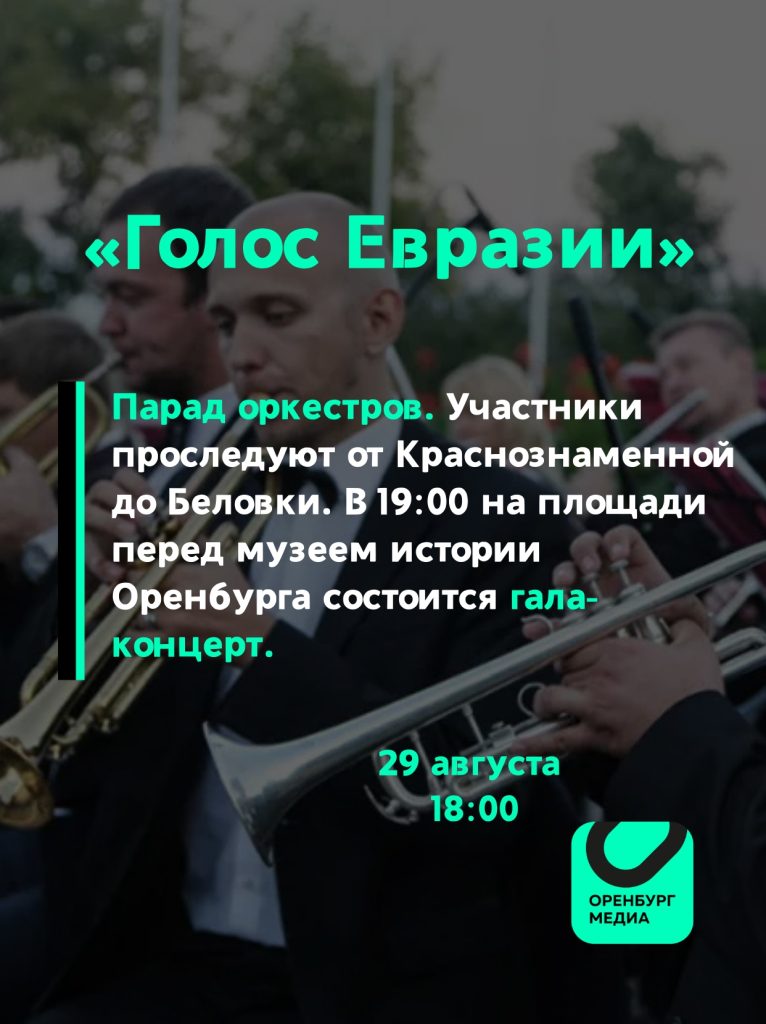 • В 19.00 на площади перед Музеем истории Оренбурга начнётся гала-концерт фестиваля Гости праздника услышат невероятное звучание большого сводного оркестра участников Международного фестиваля джазовой и духовой музыки «Голос Евразии».