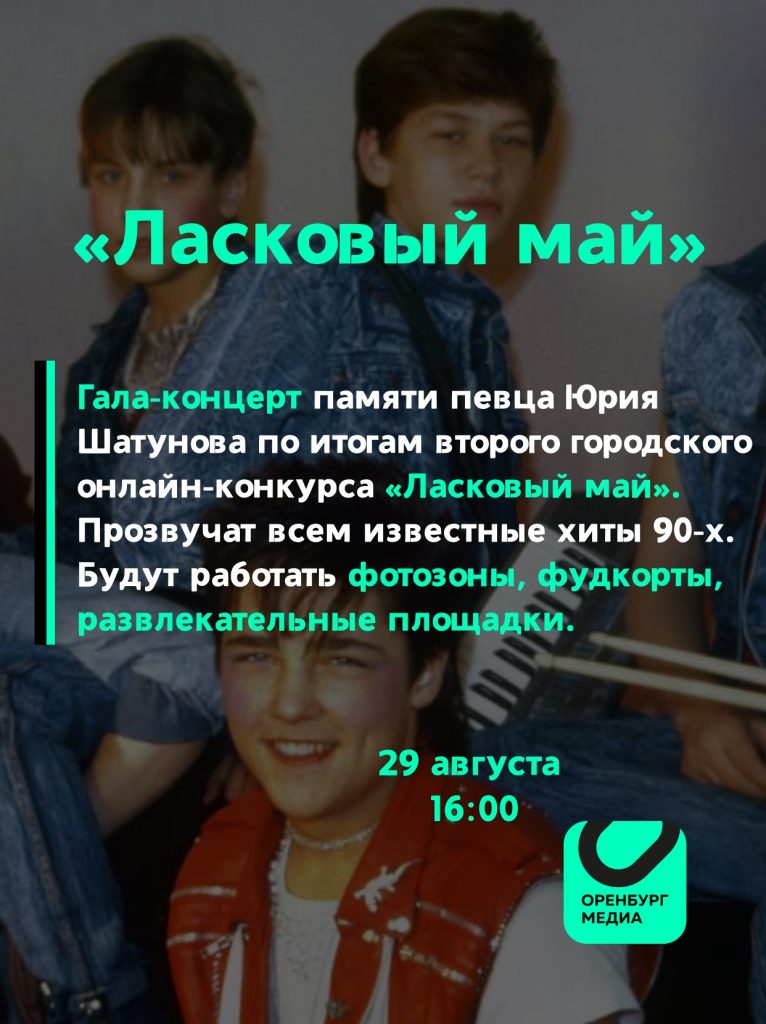 • С 16.00 до 21.30 посетителей парка «Ласковый май» ждут игровые развлекательные площадки. Здесь же состоится одноимённый гала-концерт городского конкурса памяти Юрия Шатунова и Сергея Кузнецова.