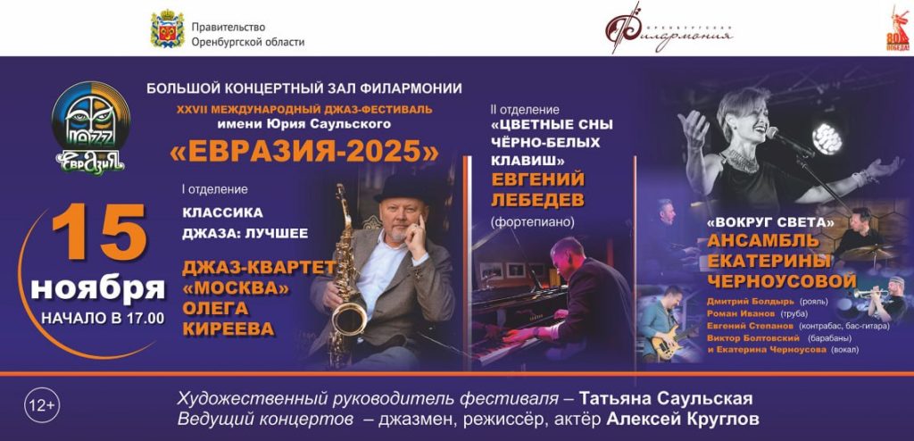Напомним, фестиваль «Евразия» был основан выдающимся композитором и народным артистом России Юрием Саульским, задумавшим сделать Оренбург центром джазовой культуры. Сегодня это событие остаётся визитной карточкой региона и одним из самых престижных музыкальных форумов страны. Организаторами выступают Правительство Оренбургской области и Оренбургская областная филармония при поддержке художественного руководителя Татьяны Саульской и ведущего Алексея Круглова.