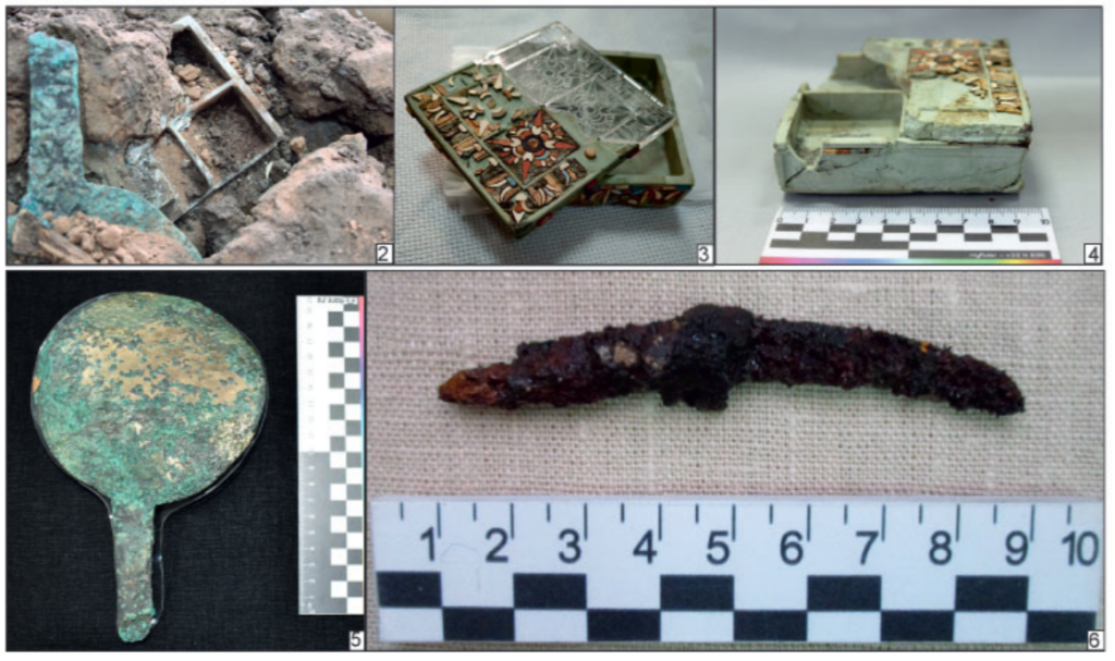 Еще более интересная находка принадлежит к савроматской культуре VI или V века до нашей эры. В могиле пожилой дамы обнаружили бронзовое зеркало, три железных шилья и зеленоватую шкатулку примерно десять на девять сантиметров и высотой около трех сантиметров. Внутри шкатулки — четыре отдела, снаружи — отделка разноцветными стеклянными пластинами в виде розеток цветов.