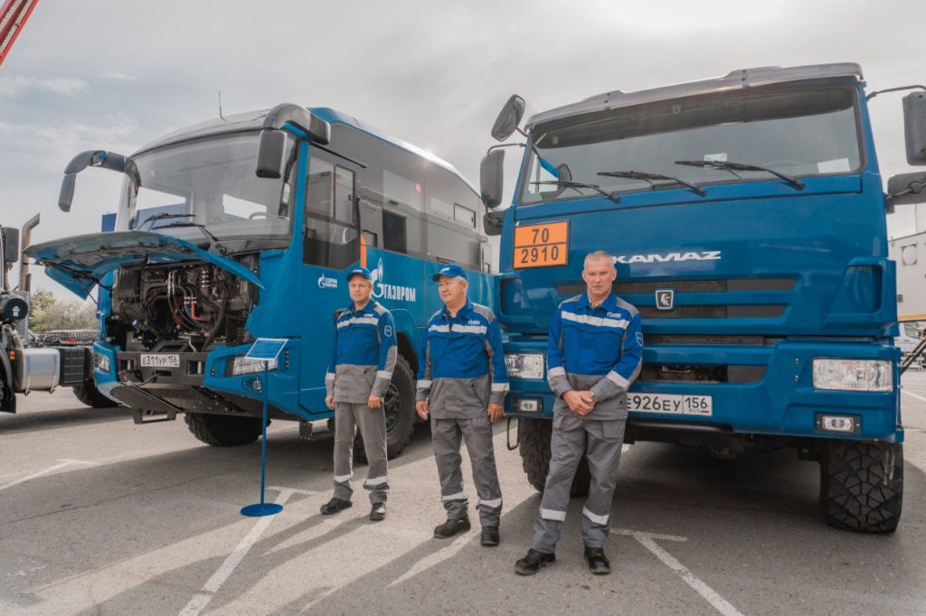 На площадке под открытым небом представлена выставка газомоторной техники предприятия, в том числе новые полноприводные вахтовые автобусы КамАЗ.
