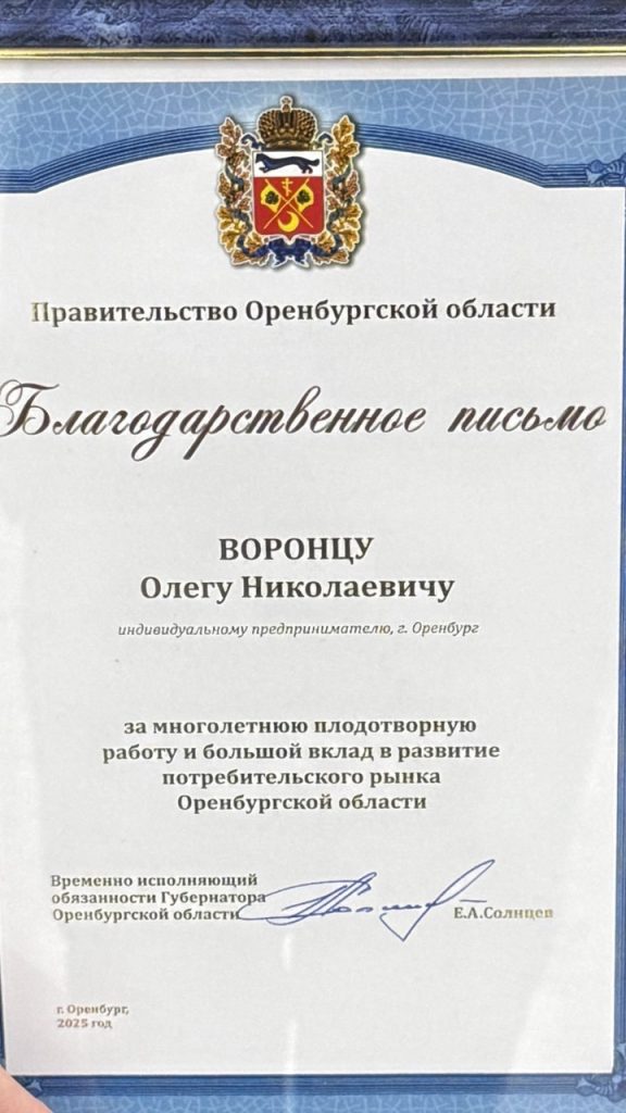 Сеть кафе «Восточка» отмечена руководством Оренбургской области за большой вклад в развитие потребительского рынка Оренбургской области. Благодарственное письмо директору компании Олегу Воронец вручил врио губернатора Евгений Солнцев в рамках агропромышленной выставки «Меновой двор».