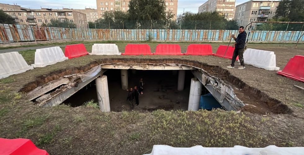 Покрытие футбольного поля обрушилось, образовав огромный провал, сообщает издание Урал56.