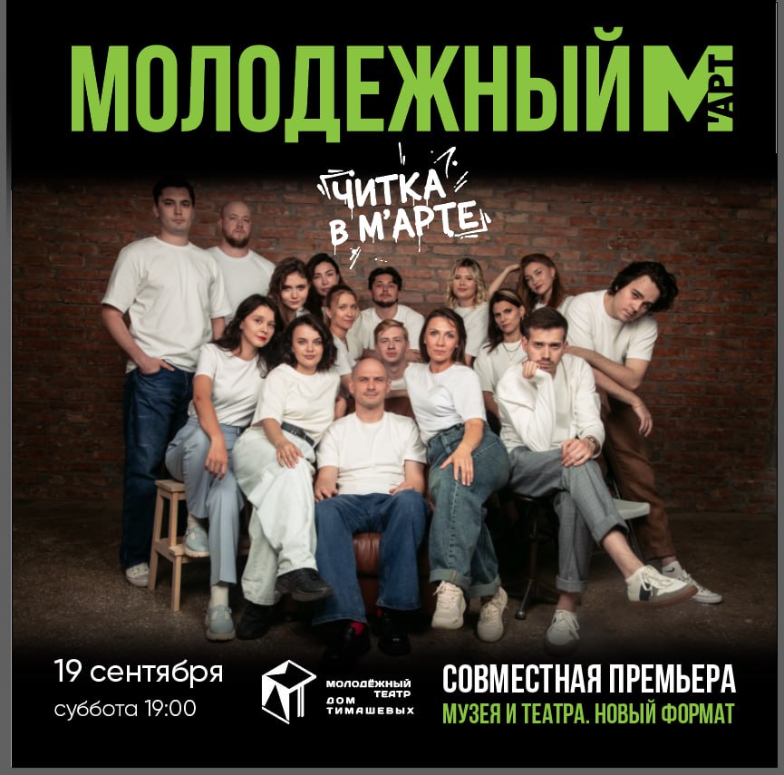 Куратор мероприятия «Молодежный. Читка в М’АРТе» (12+) – оренбургский драматург, прозаик Александр Тюжин. Он лауреат и финалист таких драматургических конкурсов, как «Евразия», «Действующие лица», «Авторская сцена», «Ремарка», «Асыл», «К новому Островскому», «Исходное событие» и др. По его произведениям поставлены спектакли в театрах Москвы, Ульяновска, Казани, Самары, Нижнего Тагила, Иркутска, Йошкар-Олы, Новосибирска и Нижнего Новгорода.