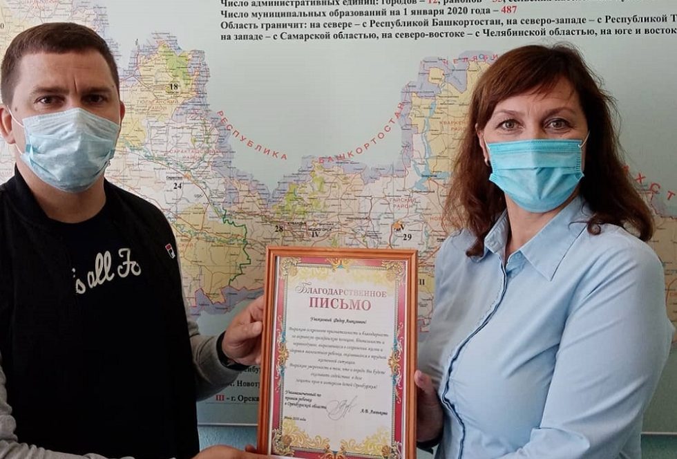 Уполномоченный по правам ребенка в Оренбургской области Анжелика Линькова вручила благодарность жителю Оренбурга Федору Феоктистову за активную гражданскую позицию и неравнодушие.