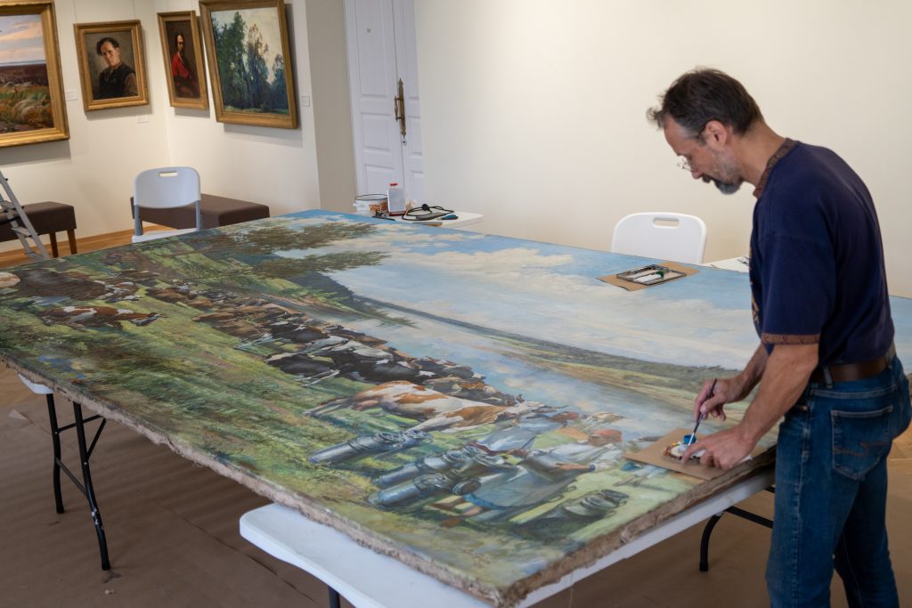 Работа «Колхозное стадо» страдает из-за своих огромных размеров – 2,5 на 3 метра. Она буквально сползает с подрамника, деформируется под тяжестью собственного веса. Реставраторам пришлось перетягивать огромное полотно и восстанавливать края холста.