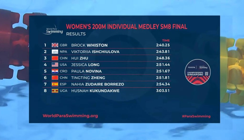 Виктория Ищиулова преодолела дистанцию комплексным плаванием в классе SM8 за 2:43,81. Быстрее неё достигла финиша соперница из Великобритании.