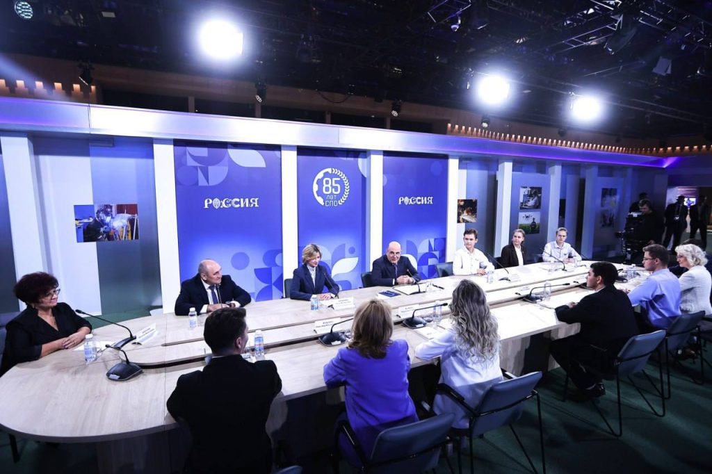 Михаил Мишустин пообщался с победителями и призёрами национальных чемпионатов профмастерства и конкурса «Мастер года». Также с премьер-министром встретились студенты и директора ведущих кластеров проекта «Профессионалитет».