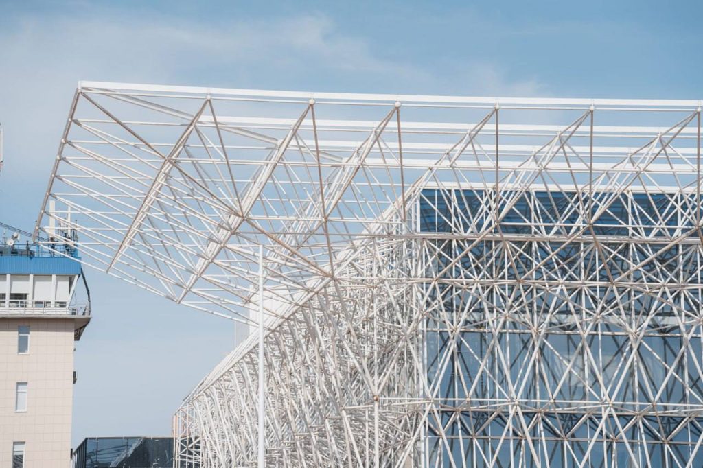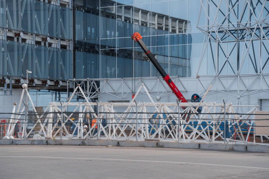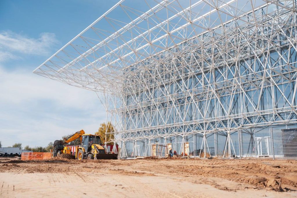 В настоящее время строители завершили монтаж монолитной части здания. Готово остекление фасада и кровли. Сборка перекрестно-стержневой пространственной конструкции «паутинки» продолжается.