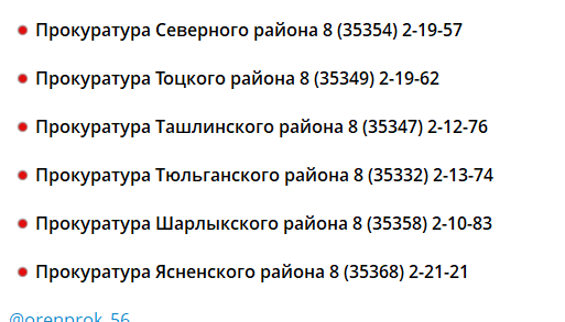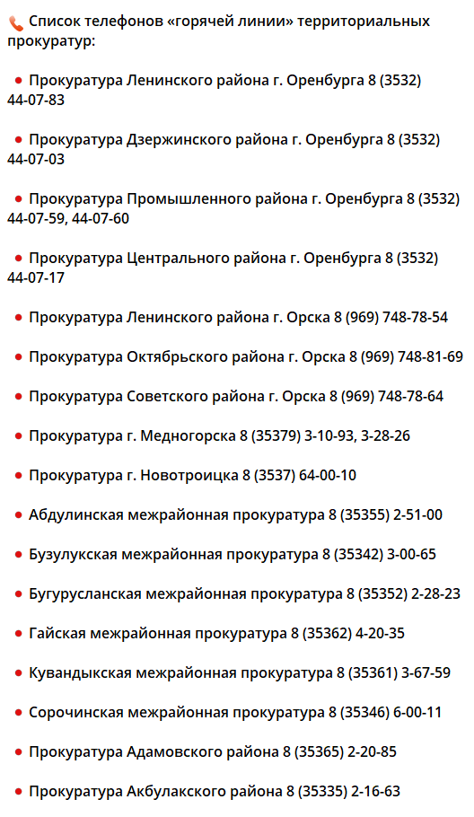 Звонки принимаются с понедельника по пятницу с 9:00 до 18:00, за исключением перерыва с 13:00 до 13:45. Прокуратура пообещала оперативно рассматривать поступающие обращения и принимать меры реагирования по каждому сигналу.