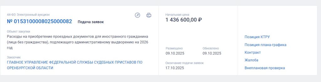 Закупка на обеспечение проездными документами иностранных граждан была размещена на сайте zakupki.gov.ru 9 октября 2025 года.
