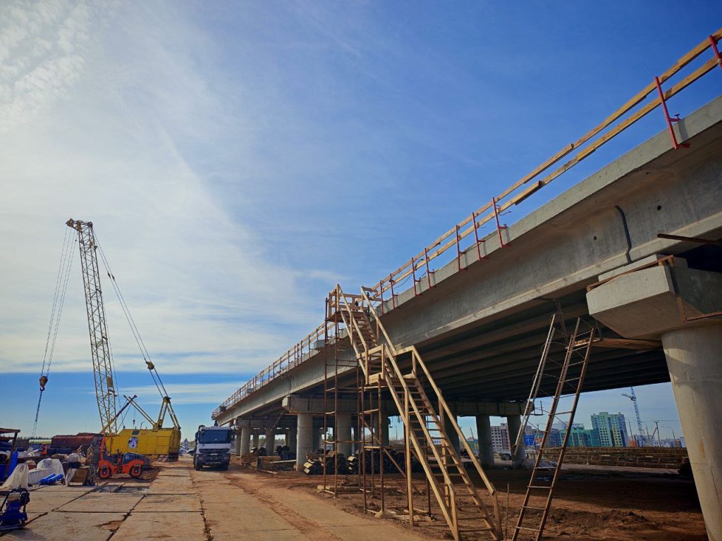 Сейчас на объекте обустраивают четыре боковых проезда, подпорные стенки, а также крайние опоры. Там же прокладывают дождевую канализацию и формируют земляное полотно.