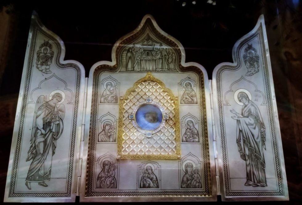 Молебен перед ковчегом с частицей Ризы Богородицы проводится ежедневно в 16.40 и после литургии.