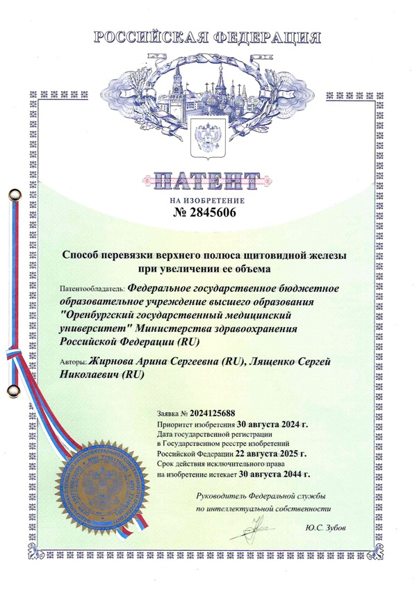 В Оренбургской области коллектив ученых разработал и получил патент на новый способ перевязки верхнего полюса щитовидной железы при ее увеличении.