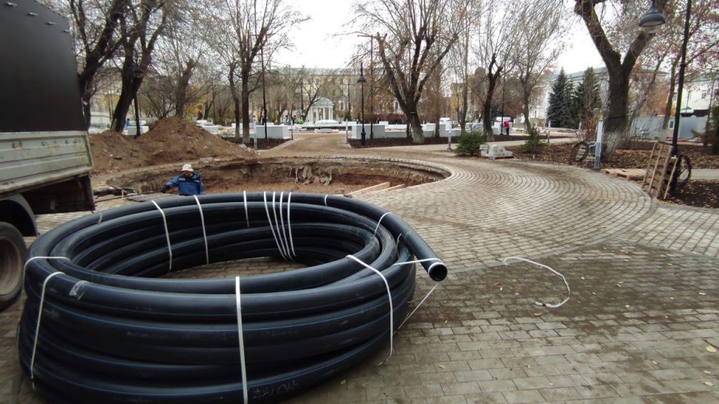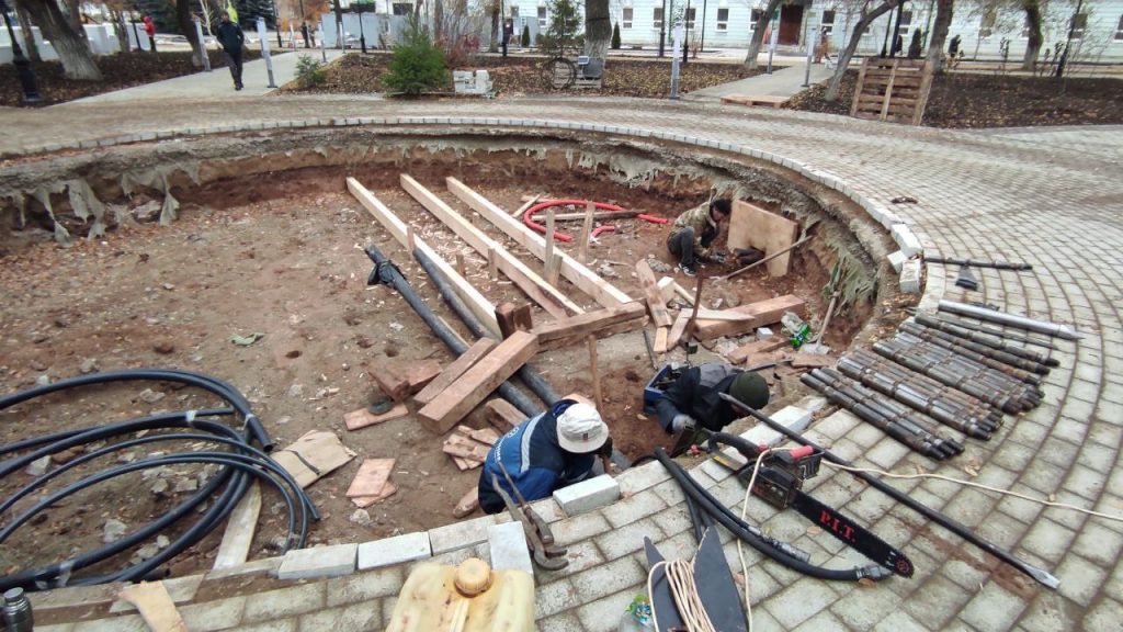 Подрядчик продолжает устанавливать наземный фонтан с ночной подсветкой, которая будет «окрашивать» воду в разные цвета. Сегодня рабочие ставят фундамент сооружения, прокладывают к нему водопровод.