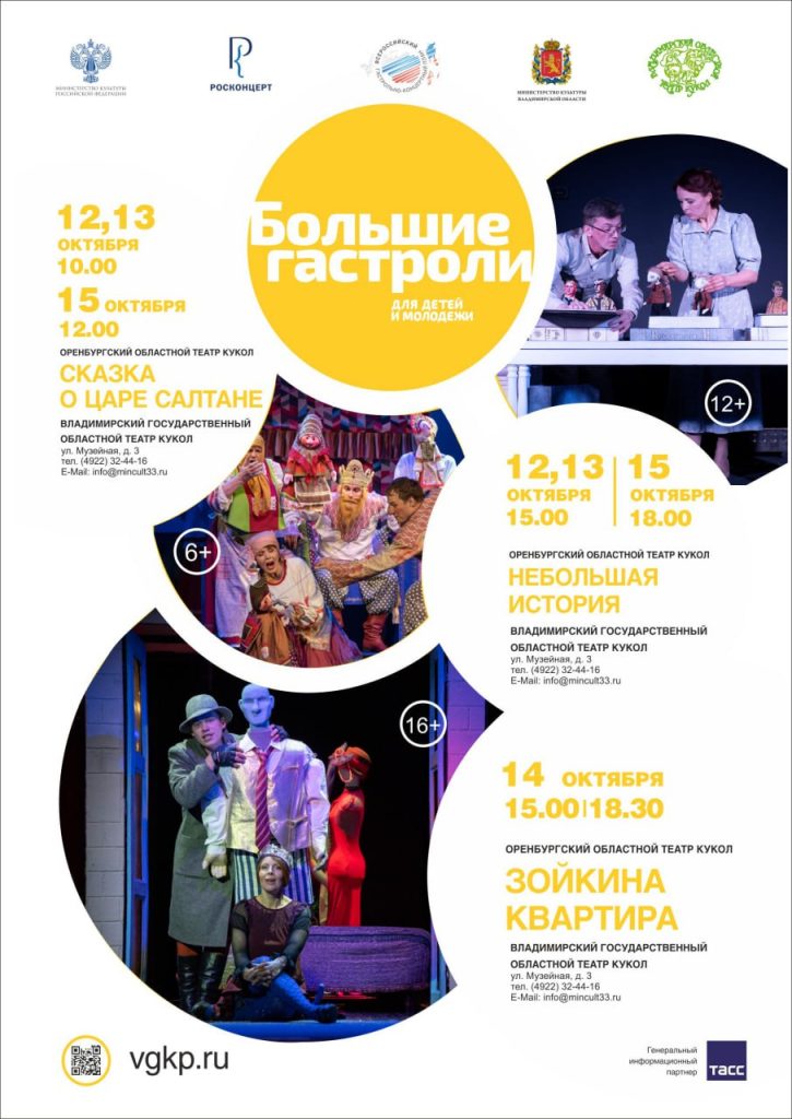 С 12 по 15 ноября в обоих городах развернутся обменные гастроли между Оренбургским и Владимирским театрами кукол. Программа реализуется в рамках федеральной программы «Большие гастроли», которую проводит ФГБУК РОСКОНЦЕРТ при поддержке Министерства культуры Российской Федерации по направлению «Для детей и молодежи».