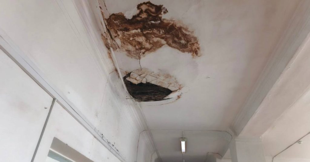В больнице из-за проблем с кровлей полностью закрыт третий этаж. Прием пациентов идет только на первых двух. В потолке — дыры, не в лучшем состоянии находится и фасад здания.