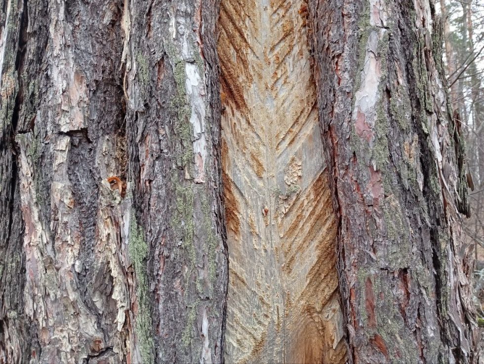 Эти вертикальные насечки похожи на застывшие слезы. И это не природный рисунок, а следы давно забытого промысла — подсочки, а сами насечки носят древнее название карры. Они — немые свидетели эпохи, когда в лесу кипела работа, и слышались удары хака в руках вздымщика.