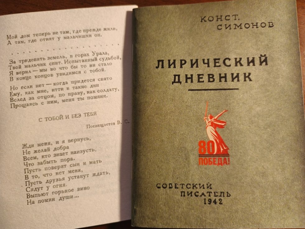 А недавно в Оренбургском книжном издательстве имени Донковцева появился необычный репринт – абсолютно идентичная копия «Лирического дневника» Константина Симонова, вышедшего в 1942 году в Ташкенте тиражом 10 тысяч экземпляров, практически не сохранившегося до наших дней.