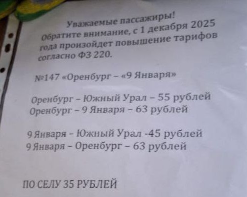 Согласно объявлению в автобусах, новая цена проезда будет действовать с 1 декабря. Из Оренбурга в Южный Урал можно будет доехать за 55 рублей, в поселок 9 Января — за 63 рубля.
