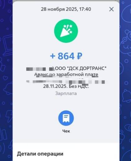 Из-за этого людей не хватает, сроки срываются, развязка вовремя не сдаётся, а транспортные проблемы горожан только усугубляются. На одном из снимков — скриншот уведомления об авансе одного из работников от 28 ноября: всего 864 рубля. Подрядчик — иногородний, но на стройку наняли оренбуржцев. Им обещали одну заработную плату, а по факту ежемесячно недоплачивают и задерживают выплаты. Не все готовы мириться с таким отношением, люди увольняются, — написал депутат Горсовета в своем телеграм-канале.