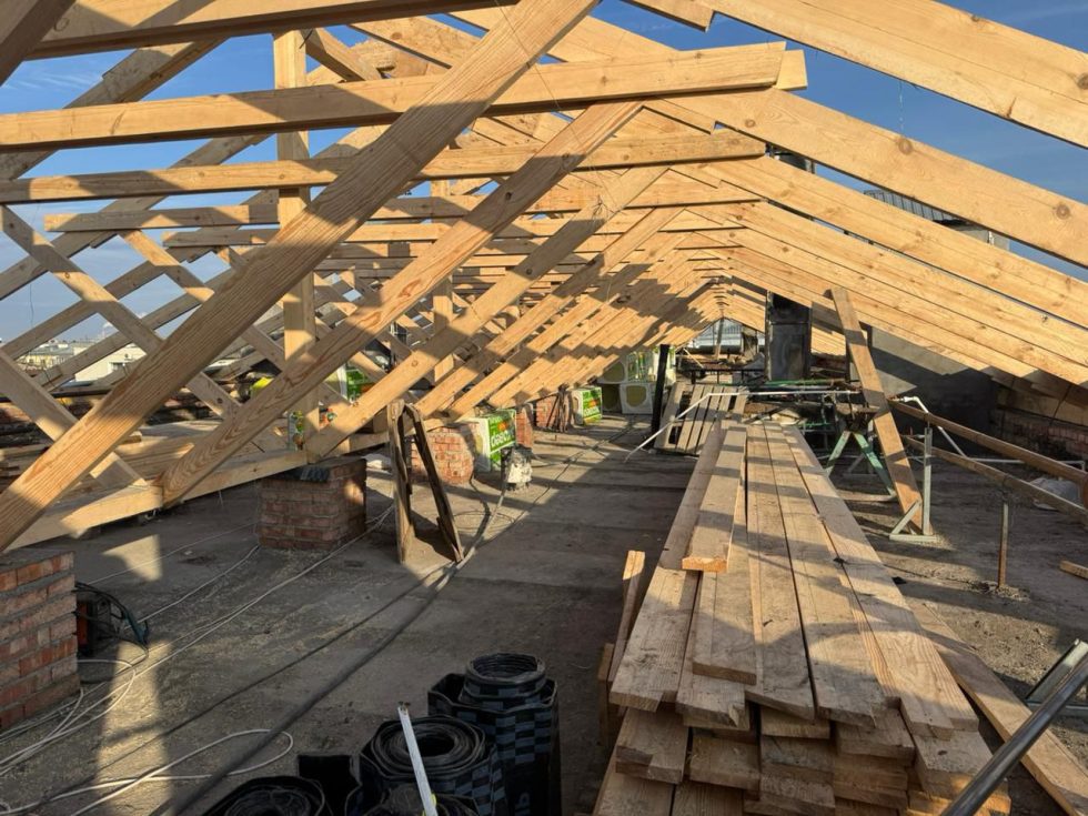Как сообщили в мэрии, на данный момент в здании полностью выложили парапет. Стропильную конструкцию соорудили на две трети.