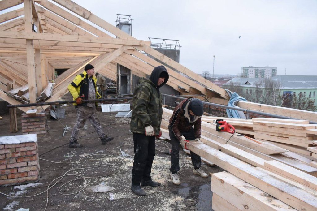 Установка стопил на кровли продолжается. Стропильные балки смонтированы на 75%. На 50% выполнили монтаж карнизов. В понедельник, 8 декабря, в доме приступят к ремонту подъездов.
