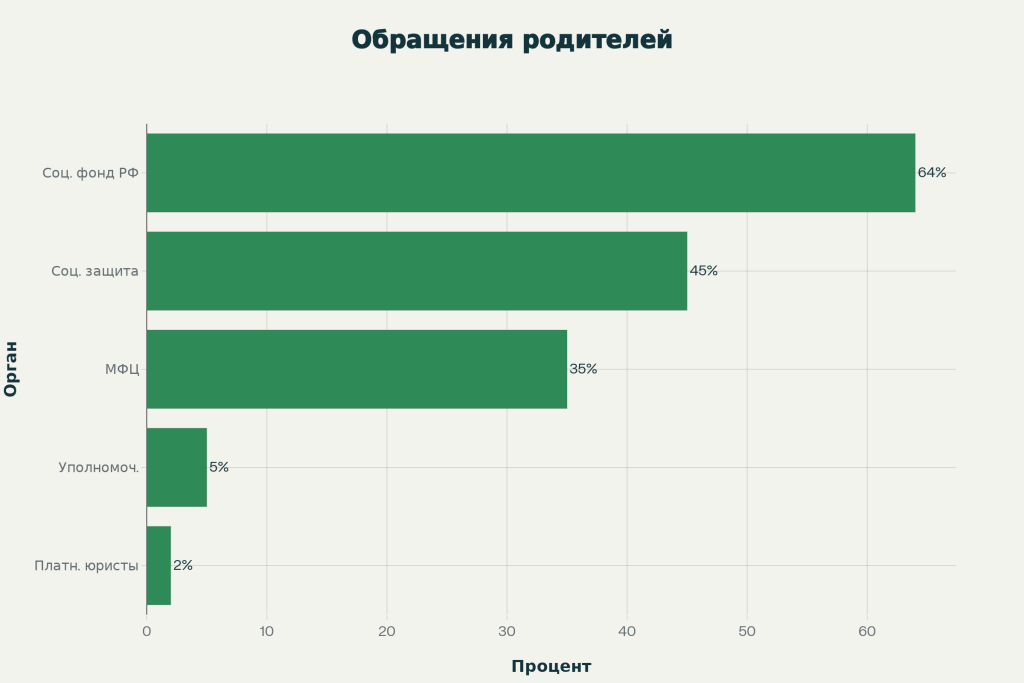 Наиболее популярный орган, в который обращаются родители для реализации прав — социальный фонд России (64%), наименее популярные — уполномоченный по правам человека (5%) и платные юристы (2%).
