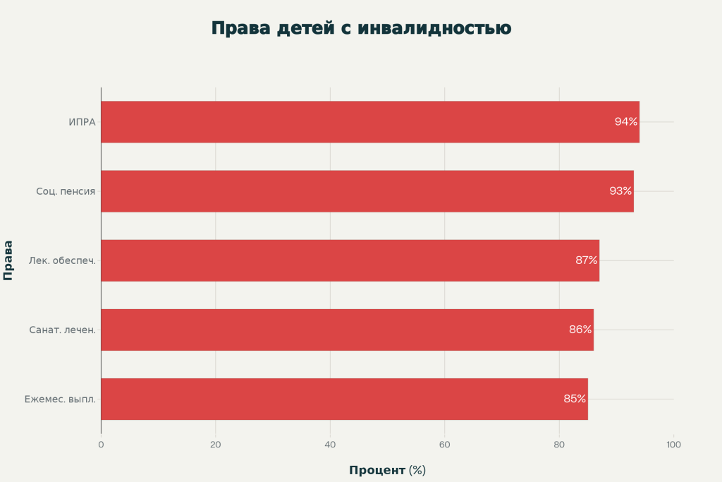 Среди прав детей с инвалидностью наиболее известными для родителей оказались право на получение индивидуальной программы реабилитации и абилитации (94%), социальную пенсию (93%), лекарственное обеспечение (87%), санаторно-курортное лечение (86%), ежемесячную денежную выплату (85%).