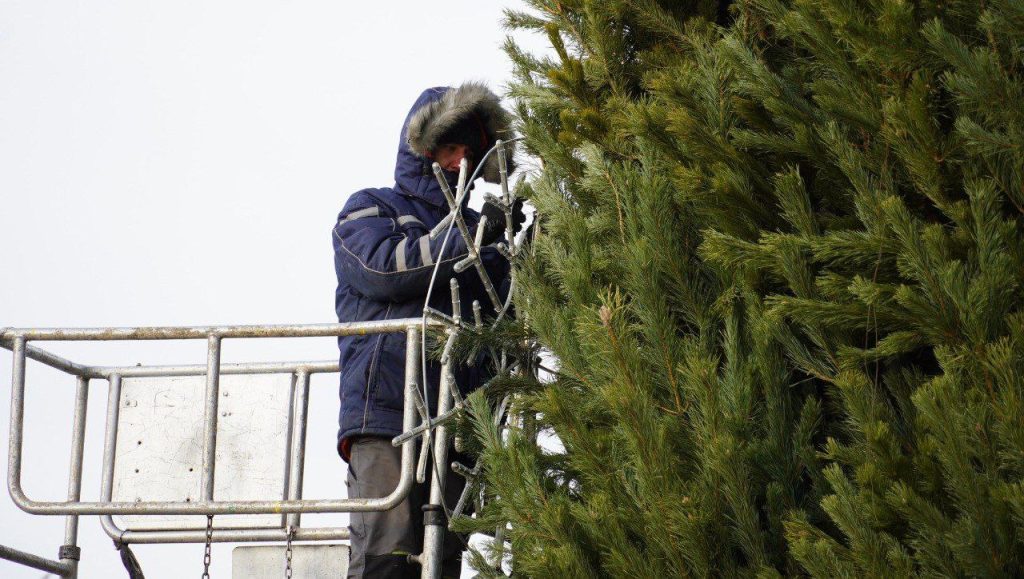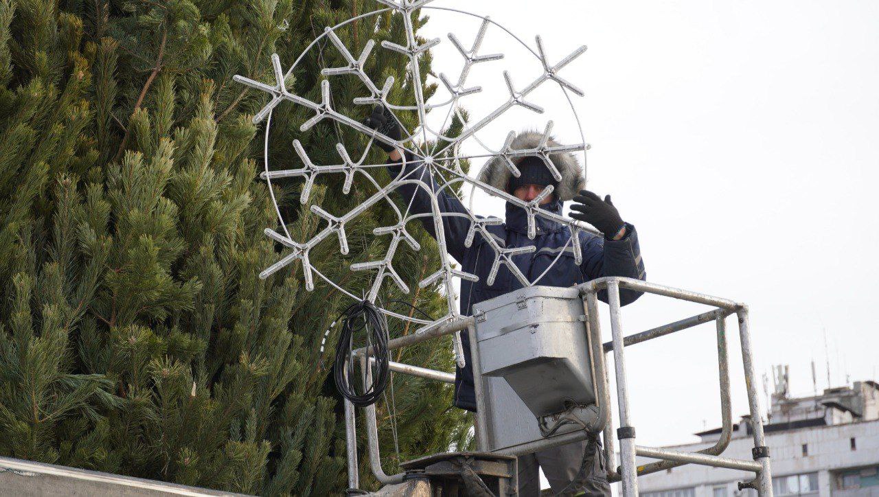 В настоящее время рабочие при помощи автогидроподъемника украшают конструкцию крупными декоративными снежинками. В ближайшие дни её украсят светодиодными гирляндами и разноцветными шарами.
