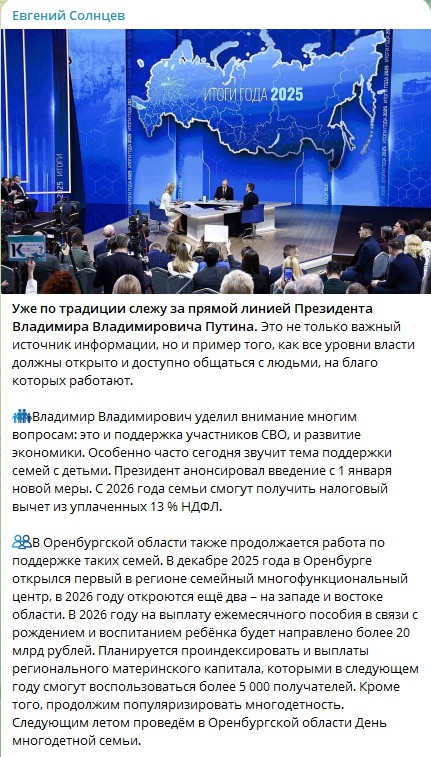Губернатор Оренбургской области Евгений Солнцев отметил, что прямой эфир с Президентом — не только важный источник информации, но и пример того, как все уровни власти должны открыто и доступно общаться с людьми. Глава региона сделал акцент на поддержке участников СВО и многодетных семей.