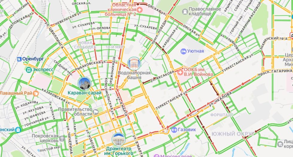 По данным сервиса Яндекс.Пробки, утром во вторник движение затруднено на большом количестве улиц в разных районах Оренбурга.
