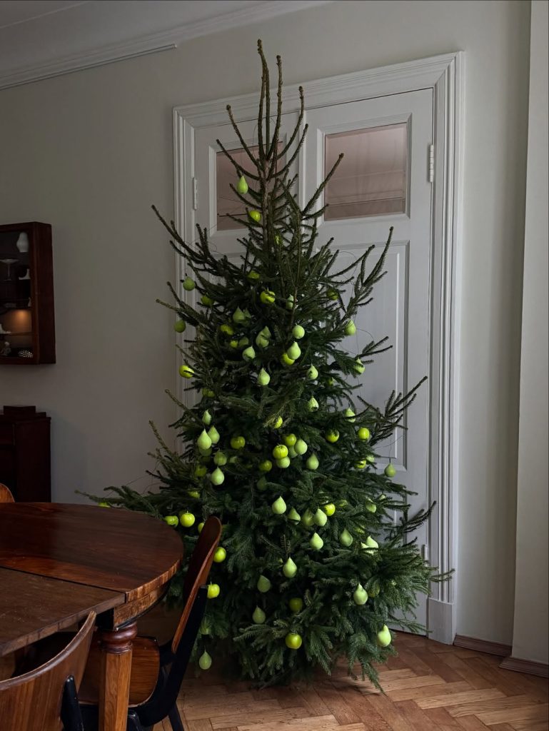 Тут речь идёт не только о присутствии данных украшений среди множества других, но и о минимализме: когда ёлка украшена только чем-то одним. Причём всё это может быть как искусственным, так и собранным своими руками в парке у дома, например. Так обычные еловые шишки путём нехитрого добавления крючков из строительного магазина приходят на смену банальным шарам. А яблоки издавна являлись символом Рождества и ёлочным украшением, символизирующим плодородие и благополучие. И, на мой взгляд, они тесно перекликаются с символом Нового года, являясь лакомством для лошадей.