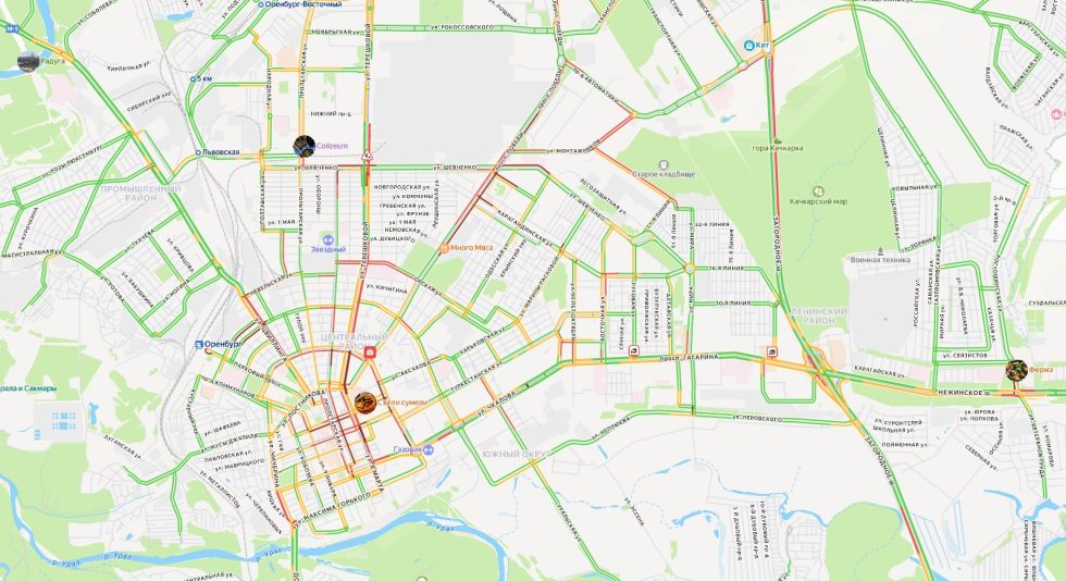Затор также наблюдают на Загородном шоссе в районе ремонта развязки, улицах Салмышской и Монтажников. Проезд по мостам через Урал относительно свободен.