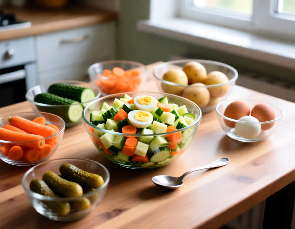 ​Со свежим огурцом:  200–300 г. курицы или колбасы, 2 картофелины, 1 морковь, 2 яйца, 1 большой огурец, 1 яблоко, 4 ст. л. горошка.