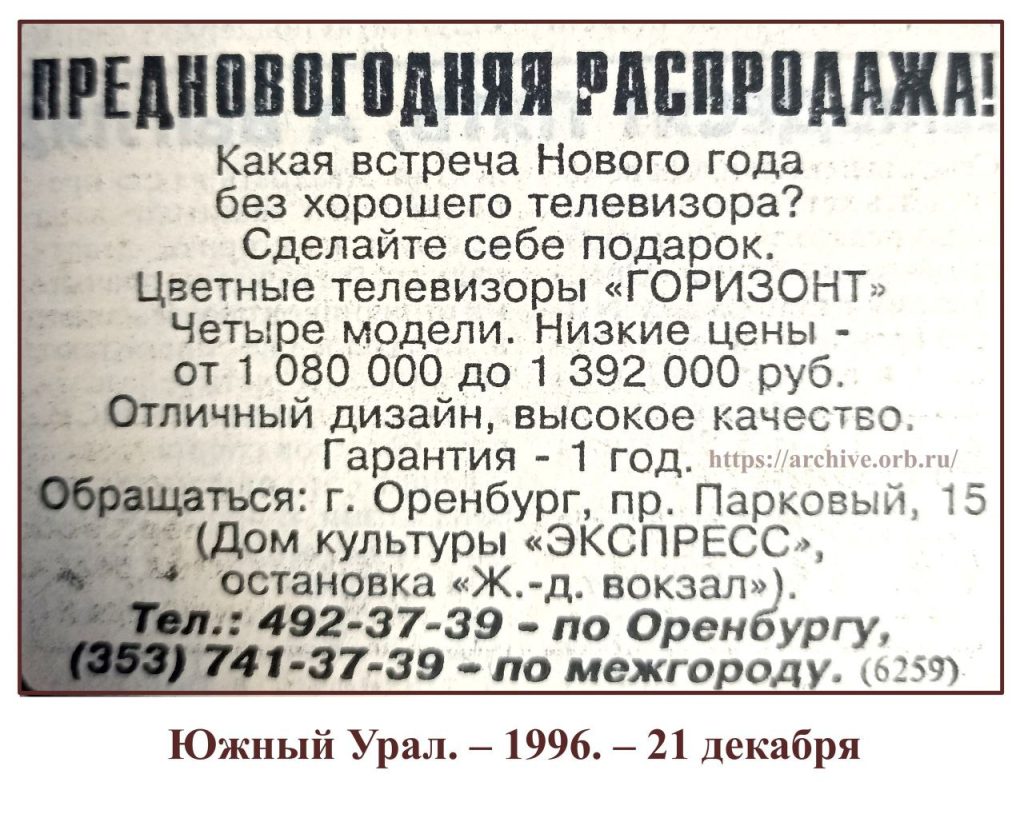 В 1990-е годы в стране произошли кардинальные перемены, которые затронули и новогодние столы и подарки оренбуржцев. К празднику горожанам предлагали купить цветные телевизоры, а на стол можно было поставить рулеты из Дании.