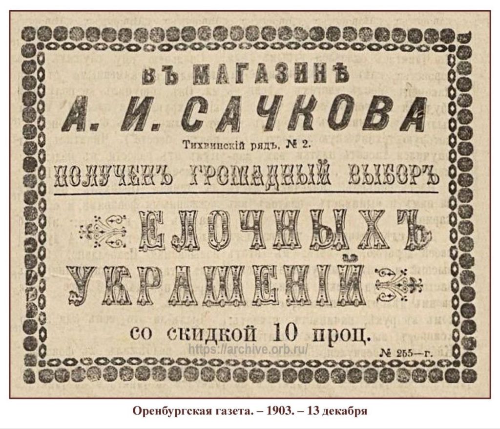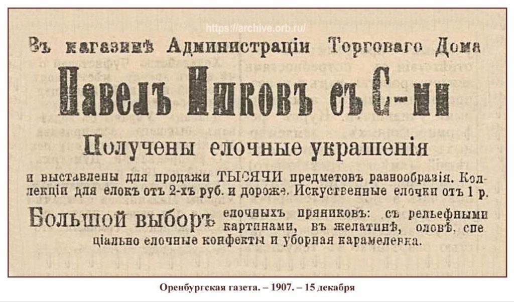 В оренбургских дореволюционных газетах публиковали многочисленные объявления о продаже елочных украшений и сладостей в преддверии Рождества и Нового года. Обратите внимание, что уже в 1907 году в Оренбурге продавались искусственные елочки — споры об их преимуществах и недостатках по сравнению с натуральными деревьями не угасли и спустя более чем сотню лет.